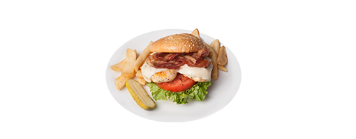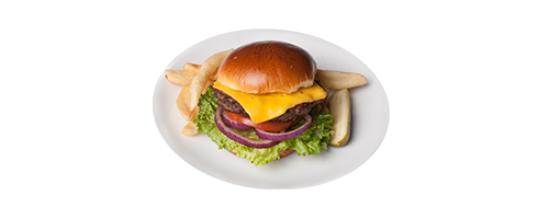 10 oz Black Angus burger on a brioche bun with lettuce and tomato.